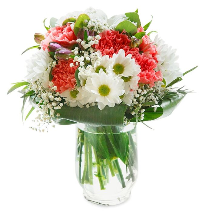 Overflowing with a harmonious blend of colour and texture, this magnificent bouquet is arranged with care and artistry, nestled perfectly in a crisp white carry bag and set before a gleaming white backdrop. Lush, ruffled carnations in coral and peach tones take centre stage, their frilled petals glowing with soft vibrance and warmth, interlaced with splashes of lively red. Bright white daisies, sparkling with sunshine-yellow centers, add a cheerful, light-hearted note reminiscent of open spaces around Tomorrow's People. Baby's breath is scattered throughout in delicate clouds, imparting a gentle innocence and finishing touch that softens the overall look. Deep green, glossy leaves create a natural cradle, fanning outward in rich arcs that invite you to linger and take in every detail. On the left, a few unopened buds tinged with purple and rose suggest the ongoing beauty and renewal that mark life's special occasions. With sturdy ribbon handles atop the bag for easy carrying, the presentation is thoughtful and refined, ready to delight as a birthday surprise or a heartfelt congratulations delivered in Tomorrow's People. Every bloom seems selected and positioned with intent, giving the entire arrangement a genuine feeling of joy and sincere connection to the local community. This bouquet truly reflects the artistry and spirit that flourish here, making it a beautiful ambassador for personal or celebratory moments alike. This exquisitely circular bouquet, arranged against a pristine white backdrop, channels the uplifting spirit of Tomorrow's People through every vibrant shade. At its glowing centre, white daisies with verdant lime hearts scatter light and purity, surrounded by plush, coral-pink carnations whose ruffled petals bring soft depth reminiscent of the area's springtime gardens. Airy clusters of gypsophila meander between the blooms, adding a celestial softness, while pale-pink alstroemeria buds edged with hints of purple emerge subtly from a rich tapestry of greenery. Eucalyptus leaves-soft and powdery green-contrast with deep, olive-hued foliage, ensuring the whole arrangement feels abundant yet fresh. Each stem is placed with practiced intent by local Tomorrow's People florists, inviting the freshness of outdoors in. Perfect for commemorating milestones-birthdays, anniversaries, heartwarming reunions-or simply brightening an ordinary day. Every detail of this bouquet, from the joyfully riotous palette to the careful mix of textures, celebrates the artistry and thoughtfulness at the core of the Tomorrow's People floral community. This bouquet, crafted near the heart of Tomorrow's People, exudes both joyful freshness and timeless grace in a clear glass vase. At its center, a flourish of ruffled coral carnations radiates warmth and cheerfulness, their textured petals full of gentle movement. Surrounding them are white daisies and chrysanthemums, their golden-green centers brightening the harmony of whites and pinks, reminiscent of local springtime along leafy Tomorrow's People streets. Delicate clouds of baby's breath wind between the larger blooms, the tiny white florets softening the overall silhouette and lending a dreamy, uplifting quality. Peeking from the left, several magenta-purple alstroemeria buds add an almost secretive promise of new color still to unfold. A lush collar of broad, glossy green leaves hugs the base, with slender greenery rising through the arrangement, imparting lively depth and a sense of natural abundance. The water-filled clear vase reveals every stem, reinforcing the bouquet's freshness and the skilled artistry of local florists. Illuminated by bright, even light, each petal and leaf is showcased in vivid clarity, with no shadow to distract from the intense colors and intricate textures. A composition such as this is ideal for commemorating birthdays, sending kind thanks, or offering heartfelt comfort-its playful spirit and refined elegance instantly welcoming positivity into any Tomorrow's People home or office.